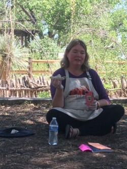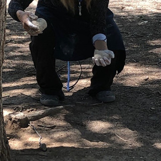 The third practice brought participants outside where they were invited to look at the clouds while kneading and shaping their clay. This practice inspired by Koivisto et al. (2009) introduced the visual element to add to the tactile work. In addition, this served as a neurobic exercise inspired by Katz and Rubin (1998). A neurobic exercise pairs senses to activate underused neural pathways. Thus, by pinching clay and observing elements of nature, two senses are being utilized in ways they may not have used before. In addition, participants elected to take a mindful walk with their clay companions. Participants were observed making imprints on their clay, exploring drying and wetting, and picking out rocks from dropped clay. Participants were invited to take note of how the outdoor setting informed or guided their work. Some replied that they were inspired to make representations, and others noted how the environment impacted their exploration. The dryness of the air, the surface participants sat on, and the patterns of the shade were noted. Participants noted the connection they felt to various plant beings, sounds, and scents. Each shared that they had a greater awareness of how their senses interacted and a general report of slowing down with more attention to their surroundings.